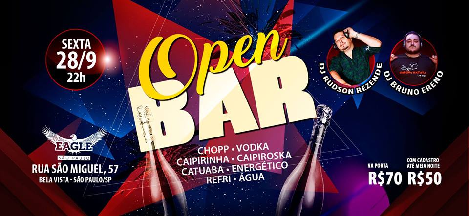 Chopp, vodca. caipirinha, caipirosca, catuaba, energético, refrigerante e água.