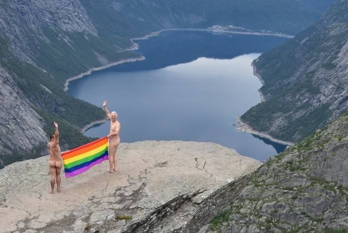 Casal gay brasileiro fica nu e estende bandeira LGBT na Noruega