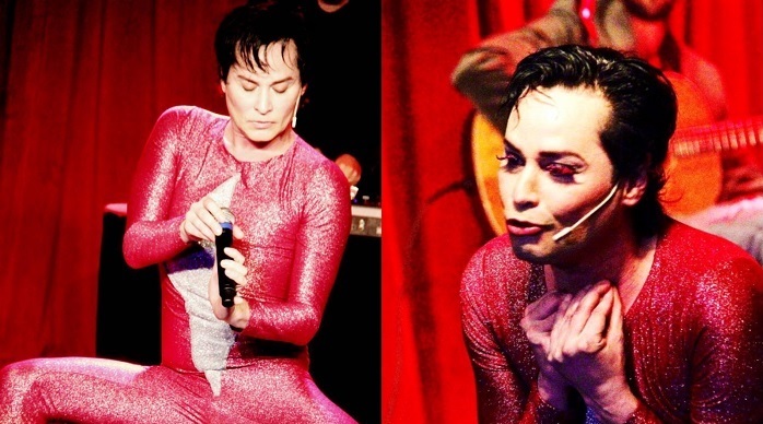 Na imagem, Mauricio, hoje com 55 anos, usa um vestido de lantejoulas ao lado de Renato, que veste jeans, camiseta e uma blusa também de lantejoulas.