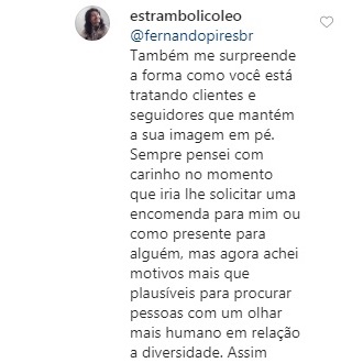 Fernando Pires chegou a desdenhar de um suposto boicote proposto por seguidores que continuavam marcando celebridades que usam sua marca, a exemplo de Iza e Daniela Mercury.